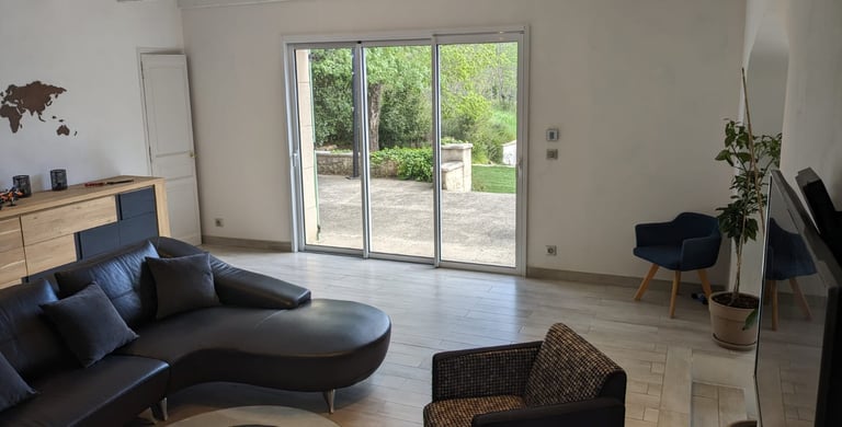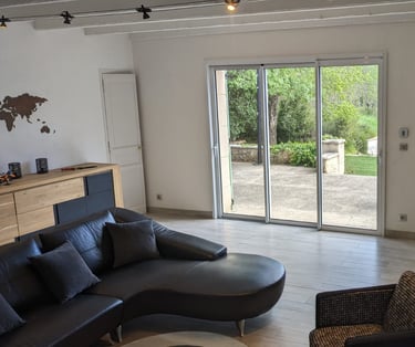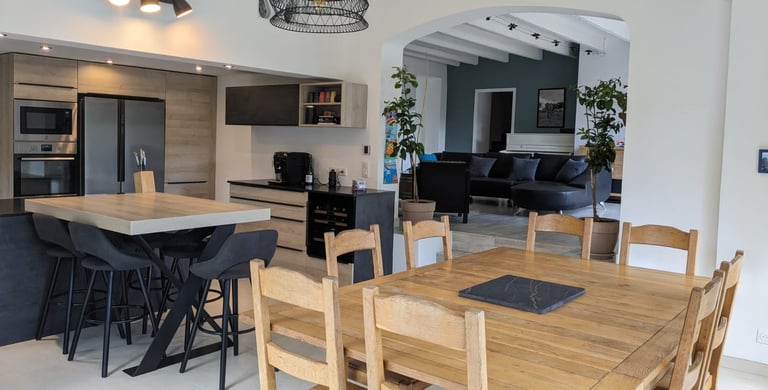 Un salon séjour cuisine très lumineux de 70 m2 avec vue sur le jardin et la piscine.
