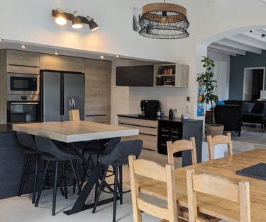 Une cuisine équipée avec ilôt central pour plus de convivialité.